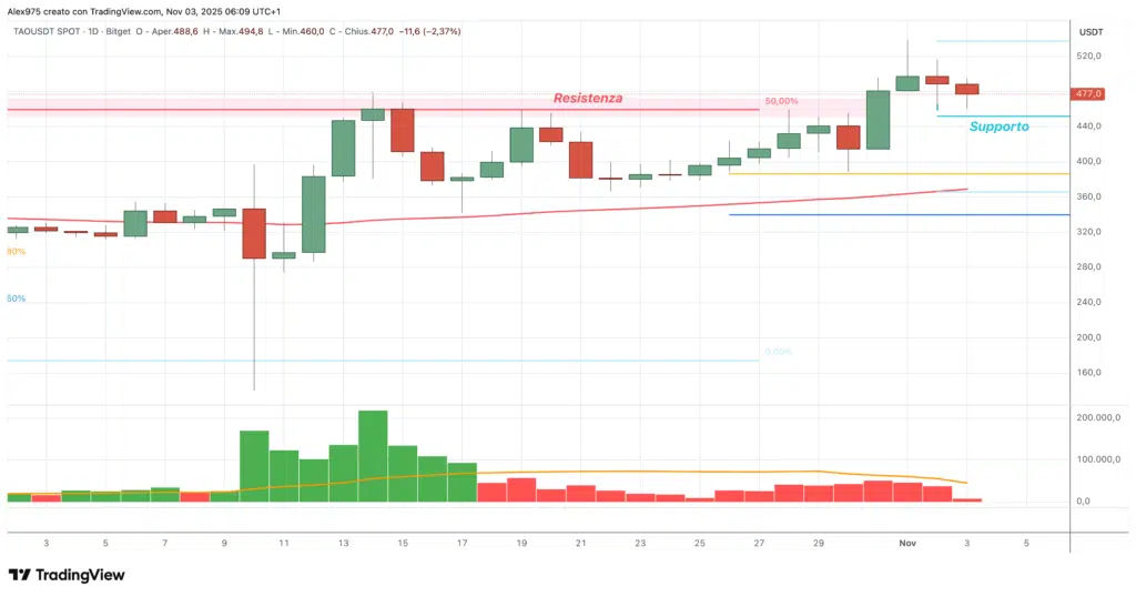 Per trovare un incremento superiore bisogna risalire a settembre 2024, quando TAO aveva segnato un +105%. Attualmente $TAO quota 477 USDT e, nelle prime sedute di novembre, mostra una lieve fase di contrazione, in lotta con l’area di resistenza.