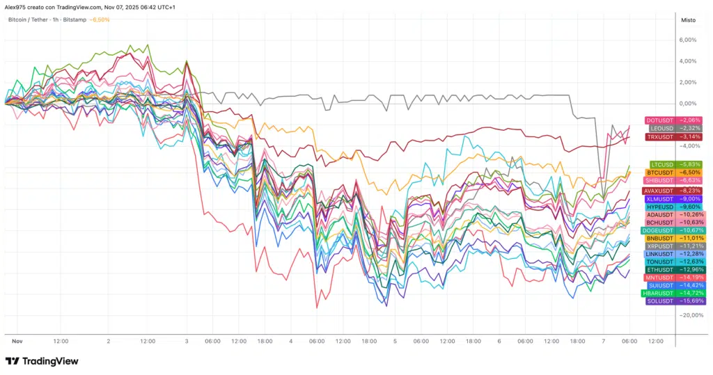 Passando al settore crypto, riportiamo l’andamento su grafico 1H dei movimenti della Top 20 a partire dall’inizio di novembre. Su questa panoramica si osserva come tutte risultino in rosso, compresa anche UNUS SED LEO, che per la sua struttura solitamente si muove meno rispetto al mercato.