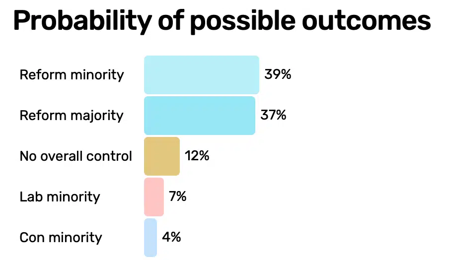 Anche se al momento parliamo di un partito di minoranza, con soli 5 seggi, Reform ha davvero la possibilità di vincere le elezioni. Più probabilmente, secondo Electoral Calculus, con una maggioranza relativa e meno probabilmente con una maggioranza assoluta.