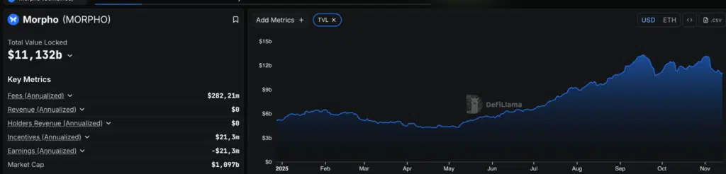 Attualmente, Morpho registra un TVL di 11,13 miliardi di dollari e una market cap di 1,09 miliardi. Le fee annualizzate si attestano a 282 milioni mentre le revenue restano nulle, mentre gli incentivi attivi superano i 21 milioni.