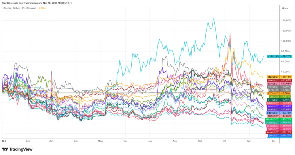 Attualmente HYPE quota 41 USDT e mostra una sequenza di quattro candele daily positive consecutive. Nel mese di novembre è in contrazione, ma con un ribasso contenuto a –5,80%, dopo il –3,40% registrato in ottobre.