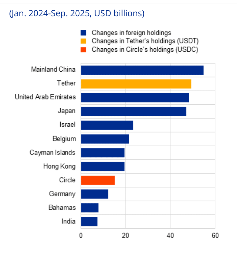 Se dovessimo considerarli degli stati, Tether e Circle sarebbero entrambi nella top 10 per acquisti di titoli USA. Tether sarebbe la seconda dopo la Cina, Circle la nona prima della Germania. È una mole di denaro importante che finisce nel debito USA. Particolare del quale si parla su questo giornale da tempo: è tutto debito a breve scadenza, cosa che rende la concentrazione degli investimenti ancora più rilevante, almeno per un certo segmento di mercato.