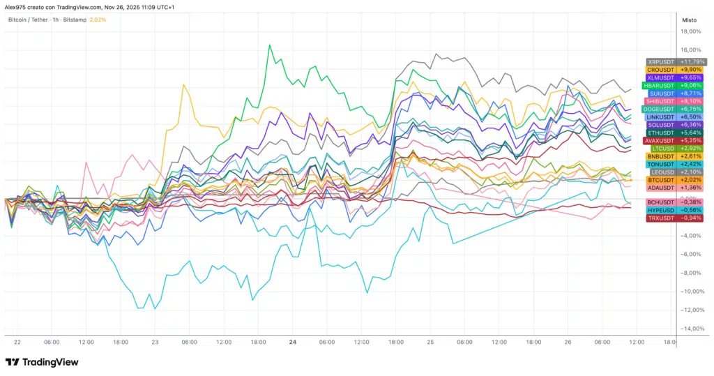 Il rialzo è generalizzato, anche se nella parte bassa si può vedere come Hyperliquid sia ancora in sofferenza, così come anche Uniswap. Quest’ultima comunque si era mossa meglio per quasi tutto novembre, così come ZCash, che se consideriamo l’intero mese di novembre è il token che sta salendo di più, con un +30%.