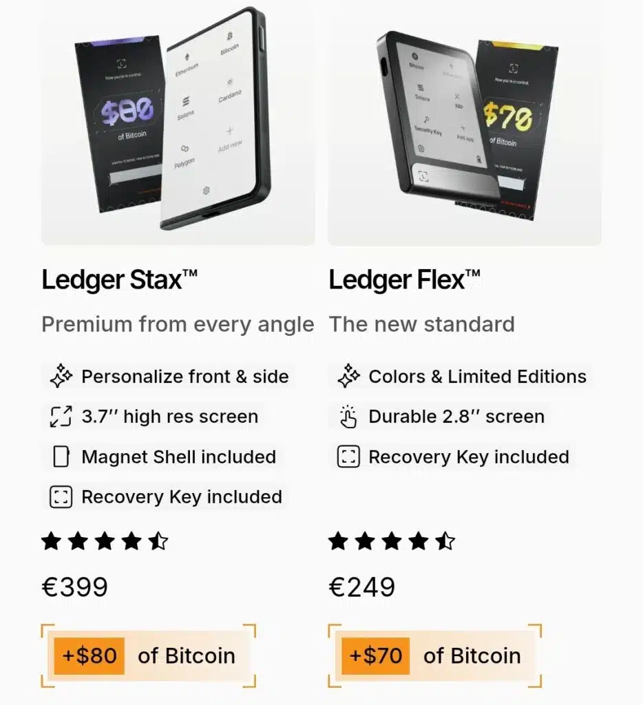 Sul quale scegliere, dipende essenzialmente dal tuo budget. Se disponi di un budget intorno ai 400€ ti direi sicuramente Ledger Stax (guardalo qui)… è incredibile e per te ben 80€ aggiuntivi in Bitcoin gratis.