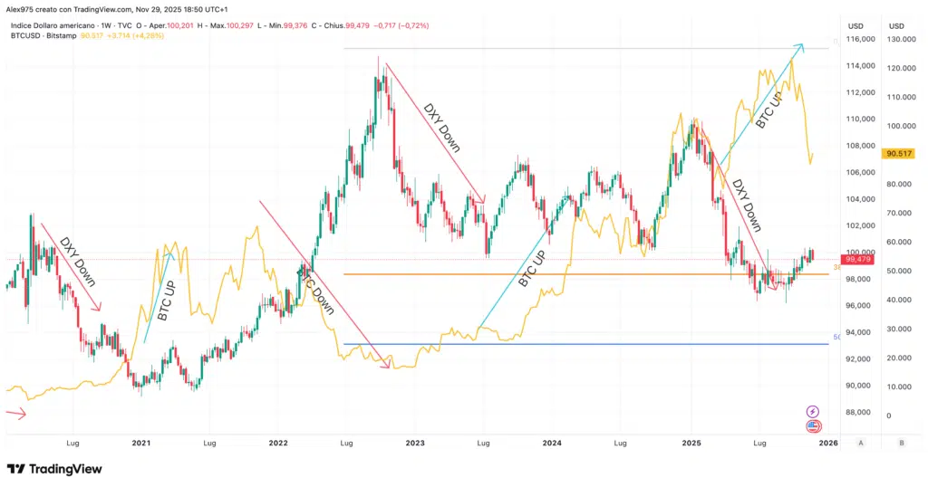 Il rapporto inverso tra Bitcoin e il Dollar Index rimane uno dei segnali più rilevanti del quadro macro, ma l’ultima fase mostra una dinamica meno sincronizzata rispetto al passato.