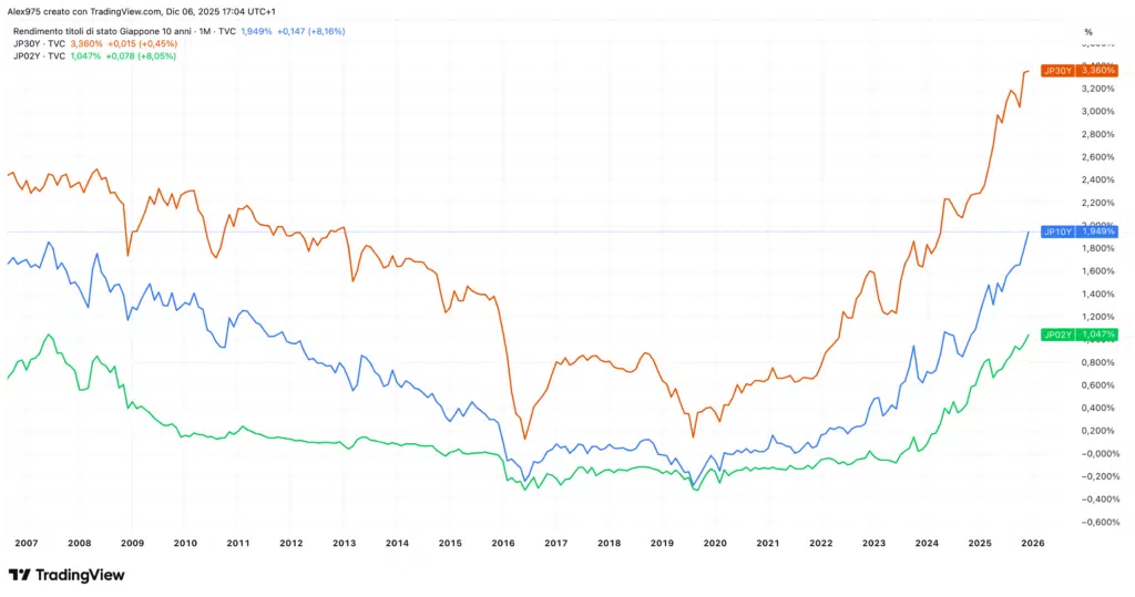 Il Giappone continuerà ad alzare i tassi di interesse, e questo è evidente anche nell’andamento dei rendimenti del decennale, del trentennale e del biennale mostrati nel grafico. Questo comporta che il vecchio carry trade, che consentiva di finanziarsi a costo nullo o quasi è destinato a essere smontato.
