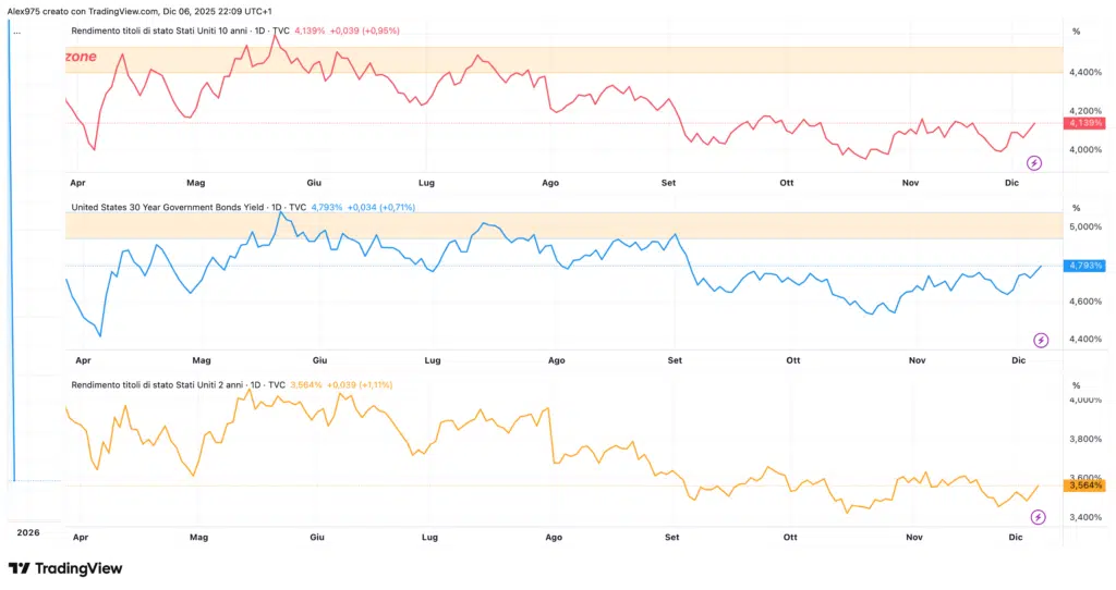 Osservando l’andamento dei rendimenti statunitensi su tutte le principali scadenze si nota una fase di crescita. Il biennale (02Y) risale verso 3,55%, segnalando attese meno aggressive sui tagli della Fed.