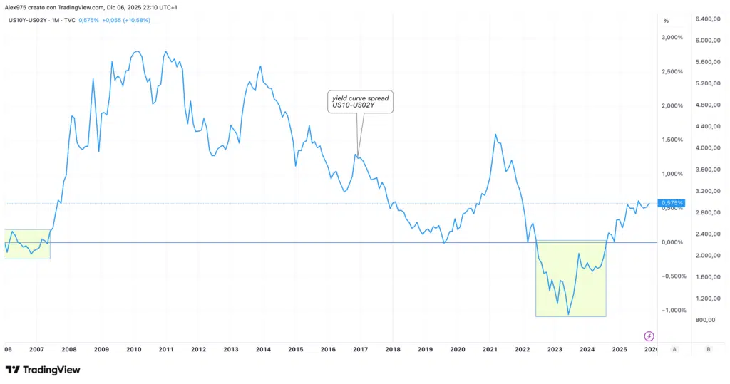 Oggi lo spread è tornato in territorio positivo, ma su livelli ancora contenuti, segnalando un contesto fragile e in riequilibrio. La risalita suggerisce che il mercato sta iniziando a prezzare tagli dei tassi e una possibile normalizzazione delle condizioni finanziarie.