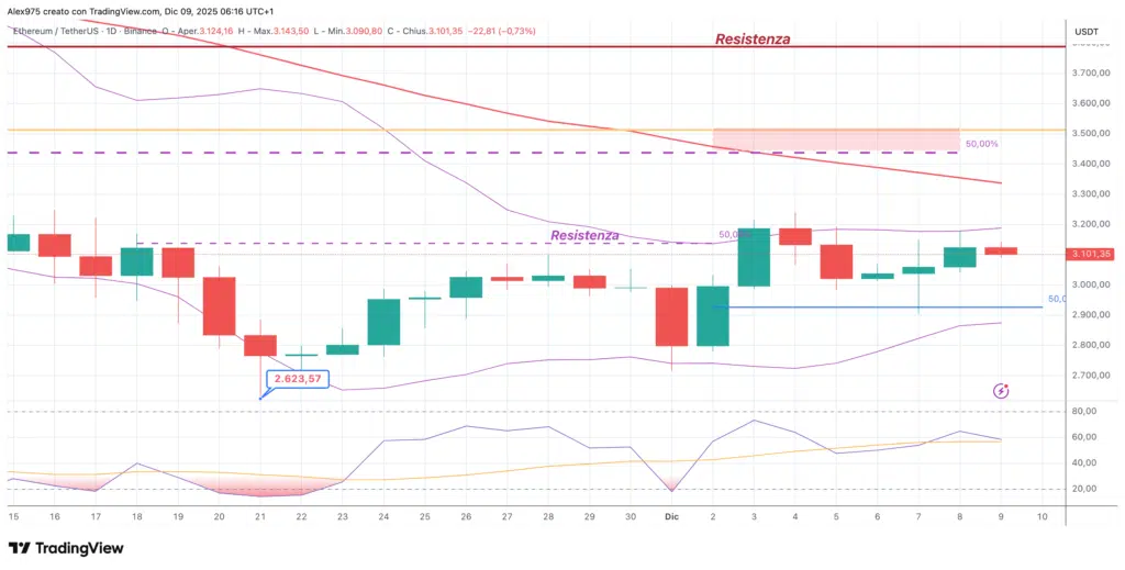 Attualmente Ethereum quota 3.106$ ed è in rialzo da tre settimane consecutive. Su base weekly registra comunque un rialzo risicato dell’+1,51%, mentre da inizio dicembre il progresso è del +3,75%, in recupero dopo il -22,20% di novembre. Da inizio 2025 è invece in rosso del -6,70%.