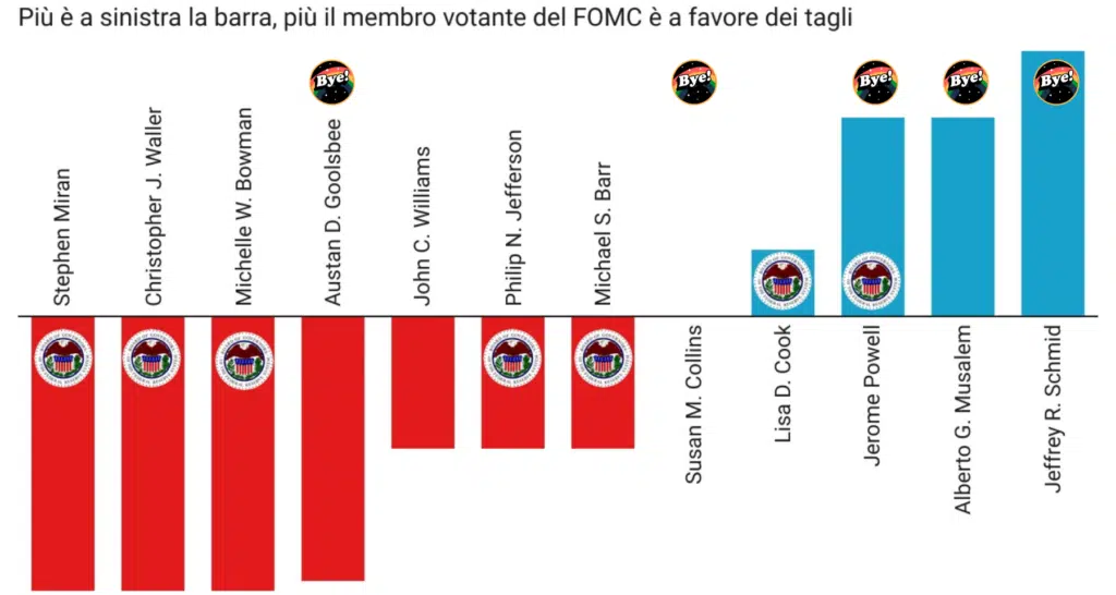 I nomi con il bollino BYE sono quelli che non voteranno più nel 2026 (nel caso di Powell, da maggio in poi). Ora la situazione invece in termini di rimpiazzi. Ovvero la nuova configurazione del FOMC dopo il cambio.