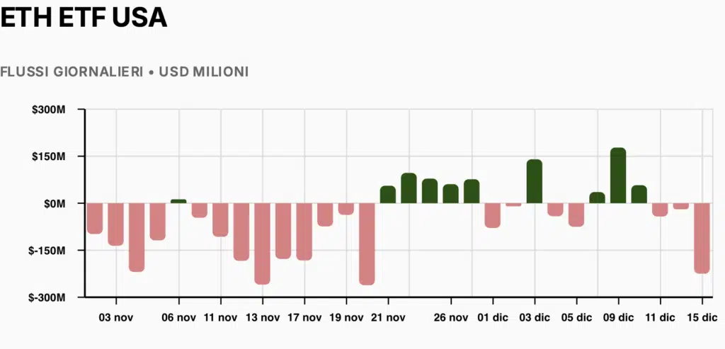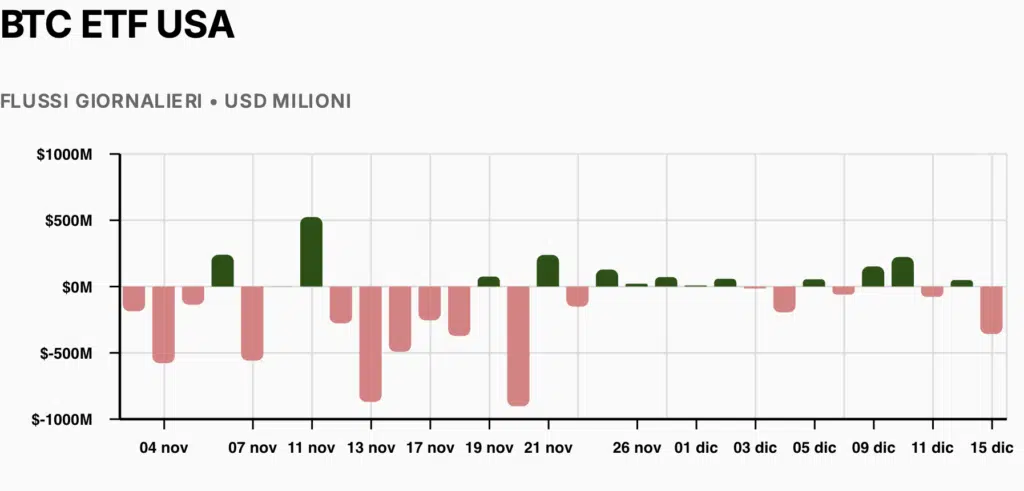 Bitcoin nella sola giornata di ieri ha visto la fuoriuscita di capitali per 357,69 milioni di dollari, mentre Ethereum ha visto la fuoriuscita di 224,78 milioni di dollari.