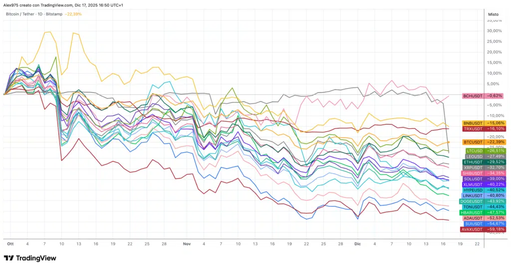 Il mese di dicembre risulta al momento sostanzialmente invariato, con una variazione del -0,90%, che segue però la pesante chiusura di novembre a -36,70%, a sua volta successiva a un ottobre chiuso a -27,50%. La sequenza evidenzia una fase di debolezza prolungata.