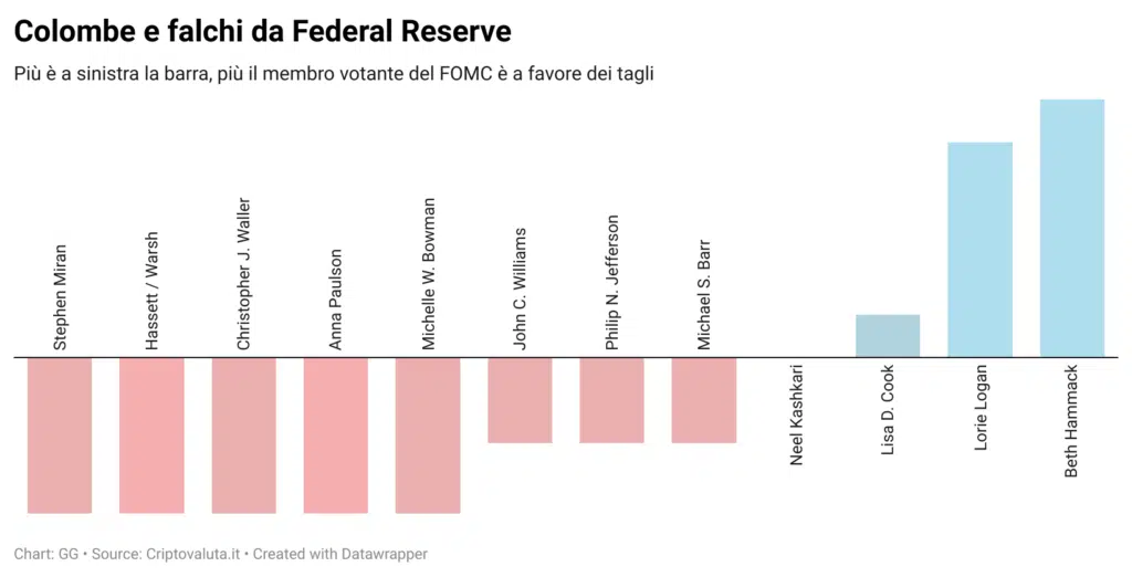Il nostro grafico, che rappresenta la prossima configurazione del FOMC, quella successiva all’addio di Powell, sembrerebbe dare ragione al presidente. I tre papabili a seguire Powell sono infatti Hassett, Warsh e Waller (che trovate molto a sinistra, ovvero in campo pieno delle colombe).