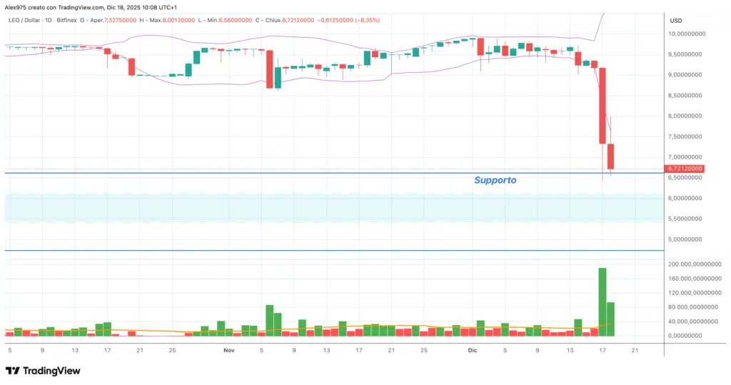Il massimo storico di Leo è stato raggiunto a marzo 2025 a 10,01$. Successivamente si è sviluppata una fase di correzione, seguita da un nuovo tentativo di rialzo in prossimità dell’area dei massimi, ora messo in discussione dalla forte pressione ribassista.