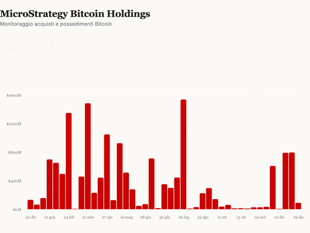 È stato un anno di acquisti intensi per Strategy, in particolare nella prima metà dell’anno, salvo poi rallentare nella seconda metà, con il ritorno ad acquisti più sostanziosi che è avvenuto soltanto dalla metà di novembre in poi. Un segnale di stanchezza non di Strategy, ma piuttosto degli investitori che avevano partecipato alle raccolte di capitale.