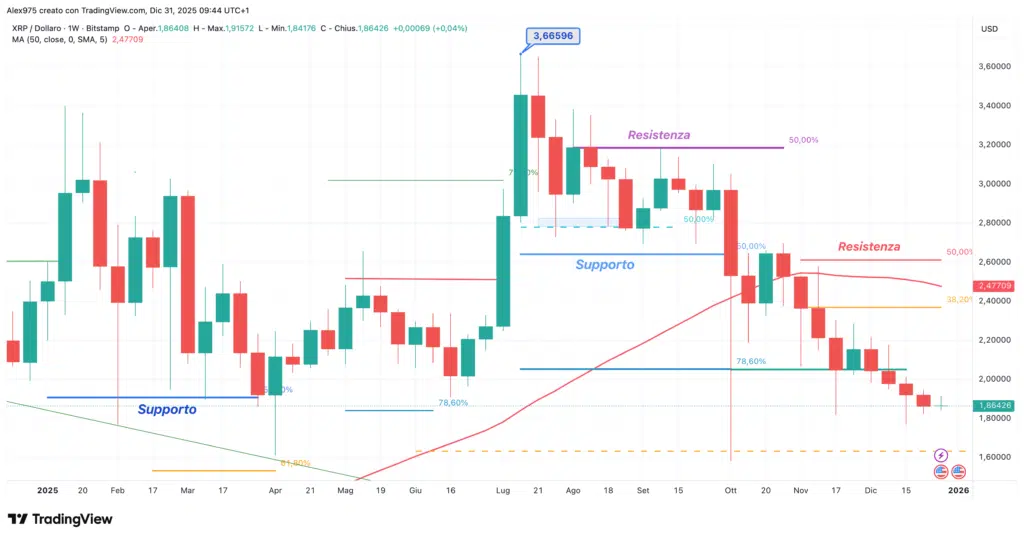 Tornando a osservare l’andamento del prezzo di Ripple sul grafico weekly, con una view da inizio 2025, si coglie chiaramente la fase di contrazione avviata dopo il massimo di luglio. $XRP sta costruendo una lunga sequenza di massimi e minimi decrescenti, con un trend ribassista ben definito.