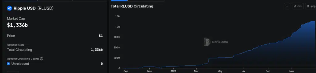 In allegato possiamo osservare il grafico di RLUDD che mostra una crescita costante dell’offerta circolante nel 2025, segnale di adozione progressiva. La capitalizzazione ha raggiunto circa 1,34 miliardi di dollari. Nel ranking globale delle stablecoin RLUSD occupa attualmente la posizione numero 10, superata da Circle USYC.