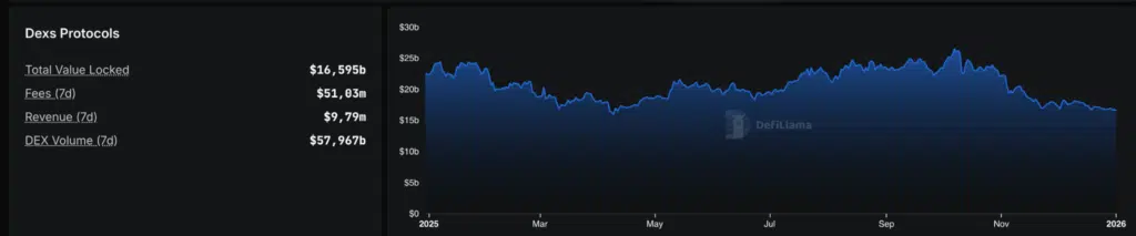 A fine 2025 la Total Value Locked (TVL) dei DEX pari a circa 16,6 miliardi di dollari, con volumi settimanali superiori a 57 miliardi.