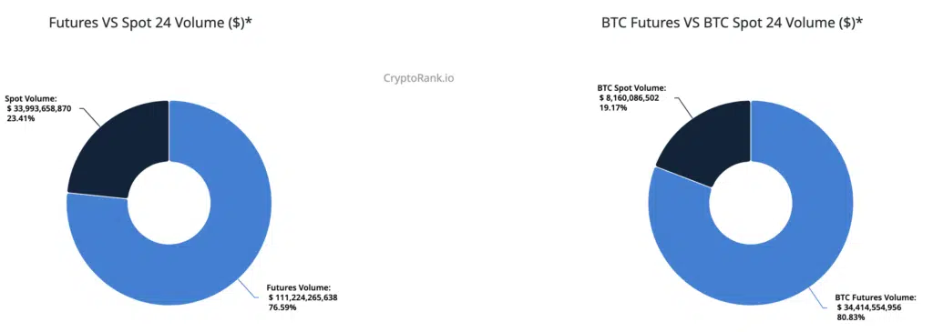 Il grafico allegato di CryptoRank, evidenzia come il trading crypto sia ormai dominato dai futures. Nelle 24 ore analizzate, i derivati concentrano circa il 77% dei volumi, contro poco più del 23% dello spot.