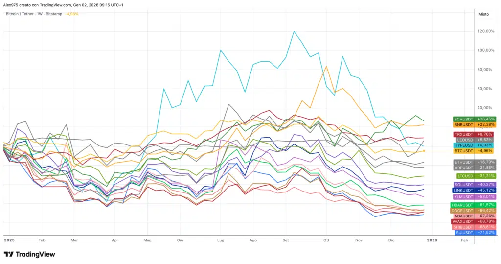 Tra le principali delusioni del 2025, considerando le crypto Top 20 per market cap, spicca l’andamento di Solana (SOL), che ha chiuso il 2025 con un -35%. Nelle prime battute del 2026 SOL quota 127,45USDT, registrando un rimbalzo iniziale di circa +2,2% dopo tre mesi consecutivi in rosso.
