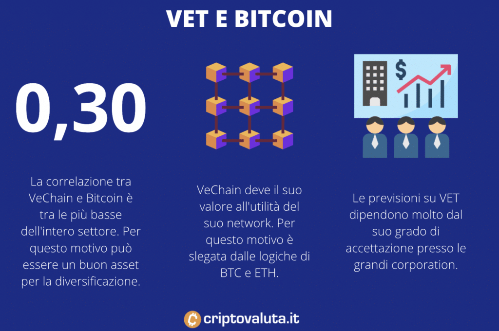Nonostante siamo davanti ad un settore che si muove il più delle volte compatto, non è detto che VeChain riuscirà a farsi trainare da eventuali crescite di Bitcoin, così come da Ethereum. VeChain ha mostrato una bassissima correlazione con il comparto – e le previsioni sulla capitalizzazione totale del mercato delle criptovalute non dovrebbero essere automaticamente trasferite sul prezzo di VET.