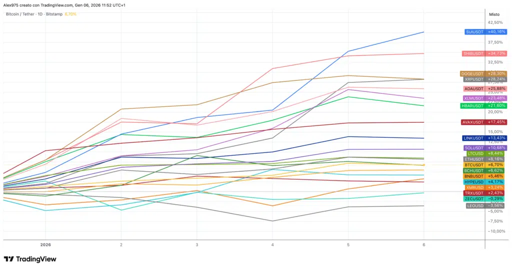 Il 2026 sta iniziando in maniera molto positiva per il mercato crypto, dopo una lunga fase di ribasso partita ormai da ottobre. Spiccano rialzi rilevanti soprattutto tra le altcoin che più hanno sofferto durante gli ultimi mesi.