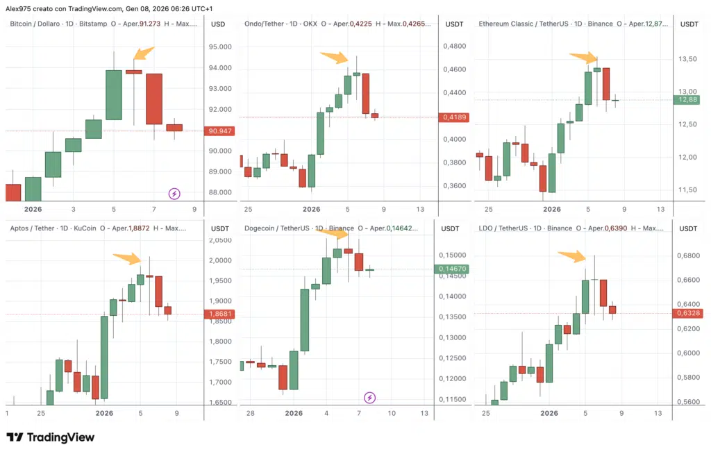 Questo movimento correttivo non è arrivato in modo inatteso dal punto di vista grafico. Già nella giornata del 6 gennaio, erano emerse alcune evidenze tecniche rilevanti, in particolare la formazione di numerose candele doji su diversi token. La doji è una candela tipica di incertezza che, quando si forma dopo una fase prolungata di uptrend, rappresenta spesso un pattern di possibile inversione, come poi effettivamente avvenuto.