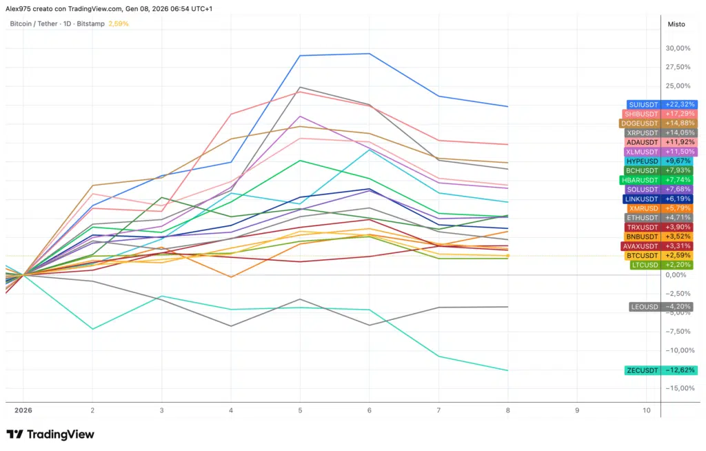 Si tratta della prima contrazione significativa del 2026, anche se al momento non altera in modo rilevante l’andamento complessivo da inizio anno, che resta per la maggior parte positivo, come visibile dalla panoramica della Top 20. Gli unici due token in rosso sono Zcash e Unus Sed Leo.