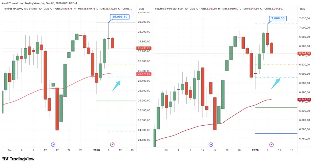 Nell’apertura dei future notturni, entrambi gli indici risultano attualmente in contrazione. In questo scenario diventa rilevante monitorare con attenzione i primi livelli di supporto di breve termine, che fungeranno da riferimento per valutare la tenuta del movimento rialzista e l’eventuale avvio di una fase correttiva più strutturata.