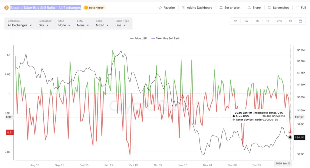 Attraverso l’indicatore Taker Buy Sell Ratio si rafforza l’idea di congestione, una fase in cui il prezzo resta laterale per liquidità scarsa e assenza di capitale deciso, lasciando il mercato in attesa. Il Taker Buy Sell Ratio misura il rapporto tra acquisti e vendite a mercato, indicando chi forza il prezzo. Attualmente resta sotto 1, segnalando vendite aggressive assorbite e mancanza di una spinta direzionale chiara.