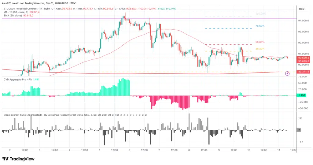 Entrando nel dettaglio analizziamo il grafico 1H del Future Perpetual di Bitcoin, scelta necessaria perché le metriche di Open Interest sono disponibili solo sui derivati. Da inizio 2026 il prezzo ha mostrato una prima accelerazione rialzista, seguita da una fase correttiva e da un progressivo rallentamento della volatilità.