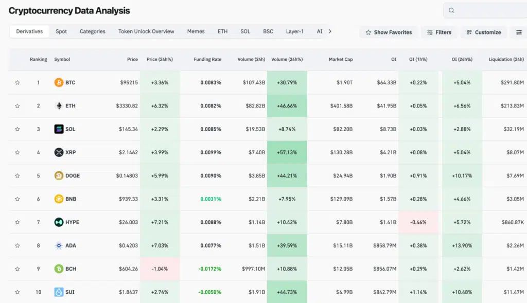 La tabella allegata mostra un’espansione dell’attività speculativa misurata soprattutto da volumi, open interest e funding rate delle principali 10 crypto sulla base della quantità di open interest e volumi sui derivati. Le crypto con più leva attiva e liquidità vengono classificate più in alto, ecco perchè Dogecoin è prima di BNB.