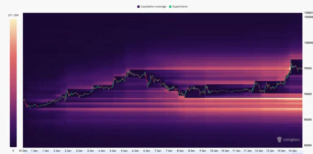 La lettura del funding rate di Bitcoin si accompagna e trova conferma nella liquidation heat map. Nella prima parte del 2026 si osserva una distribuzione abbastanza equilibrata con aree di liquidazione ben definite sia sopra sia sotto il prezzo.