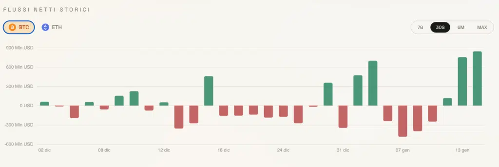 Un ottimo spunto – che conferma come il 2026 si sia aperto – almeno a Wall Street, sotto i migliori auspici. L’azione degli ETF ha avuto probabilmente un impatto sull’importante corsa di ieri del prezzo di Bitcoin e dei principali asset crypto.
