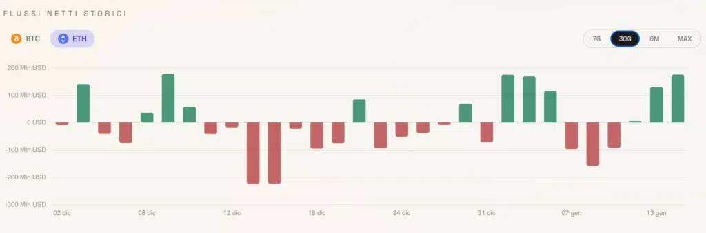 Per quanto riguarda Ethereum i numeri, in termini di inflow, sono meno importanti. “Soltanto” 175 milioni di dollari, seguendo però quello che è il rapporto tra le diverse capitalizzazioni di mercato di $BTC e $ETH. Anche questo è un ottimo risultato, per quanto forse non fuori dall’ordinario come quello di Bitcoin.