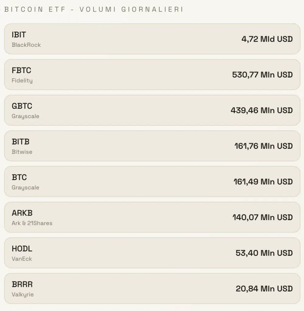 Volumi anche qui molto alti, con il solo $ETHA, l’ETF di BlackRock, che ne ha fatti registrare per 1,46 miliardi.