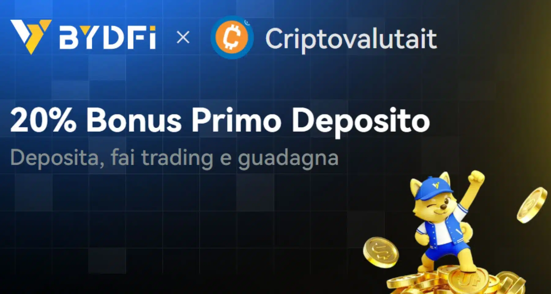 - bonus crypto BYDFi da 20 USDT: richiesto un deposito netto di 100 USDT / volume Futures Trading di 5.000 USDT;