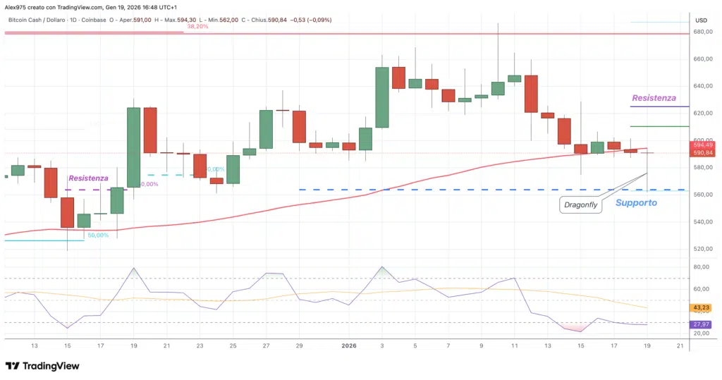Allo stato attuale BCH ha testato il supporto a 560$ da cui sta provando un rimbalzo. Oggi, sta formando una candela dragonfly, caratterizzata da una lunga shadow inferiore e da un corpo ridotto, configurazione che rientra tra le candele di inversione.