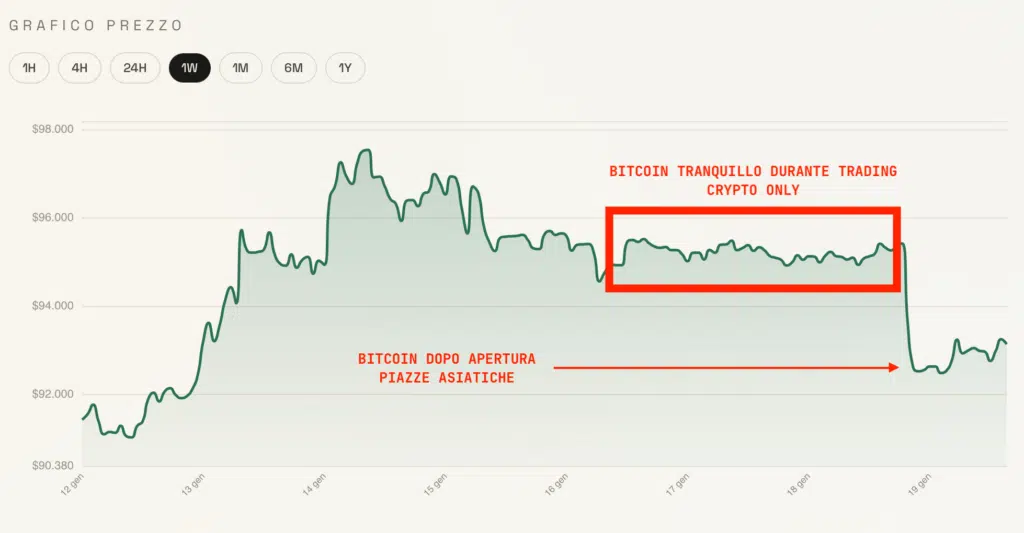 Alla riapertura delle piazze asiatiche, abbiamo invece avuto una potente correzione, che ha portato Bitcoin in quota 92.600$ in pochi minuti di trading, segnalando dunque la volontà di scarico in una fase che si faceva più preoccupante.