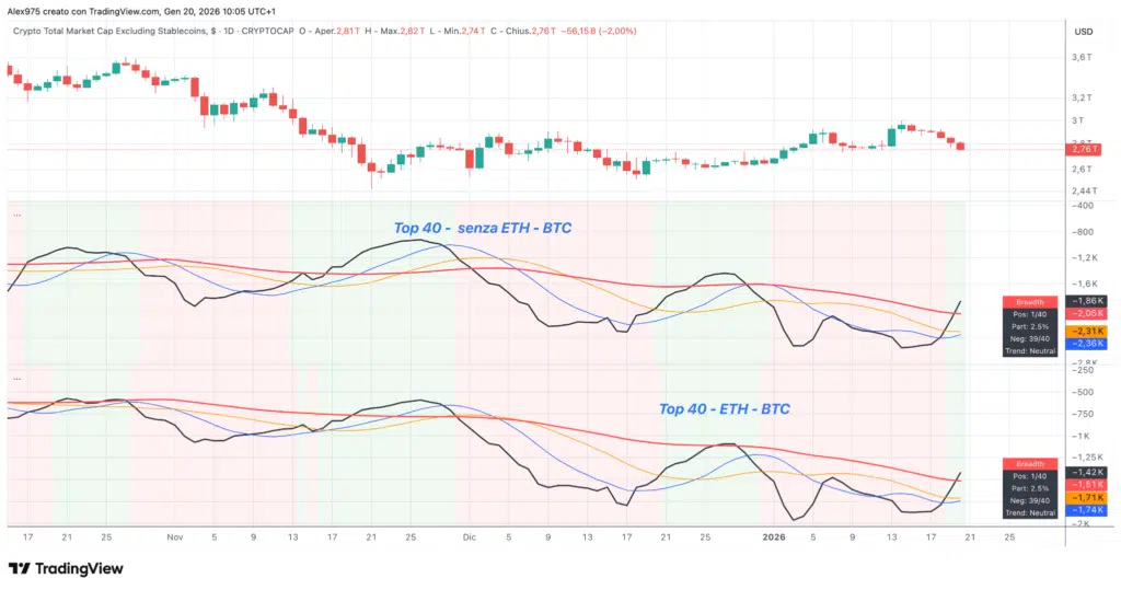 Il Breadth Engine misura la partecipazione interna del mercato crypto, non la direzione dei prezzi. Nell’attuale contesto, la market cap totale (TOTAL) continua a scendere, segnalando fuoriuscita di capitale, soprattutto dai grandi asset.