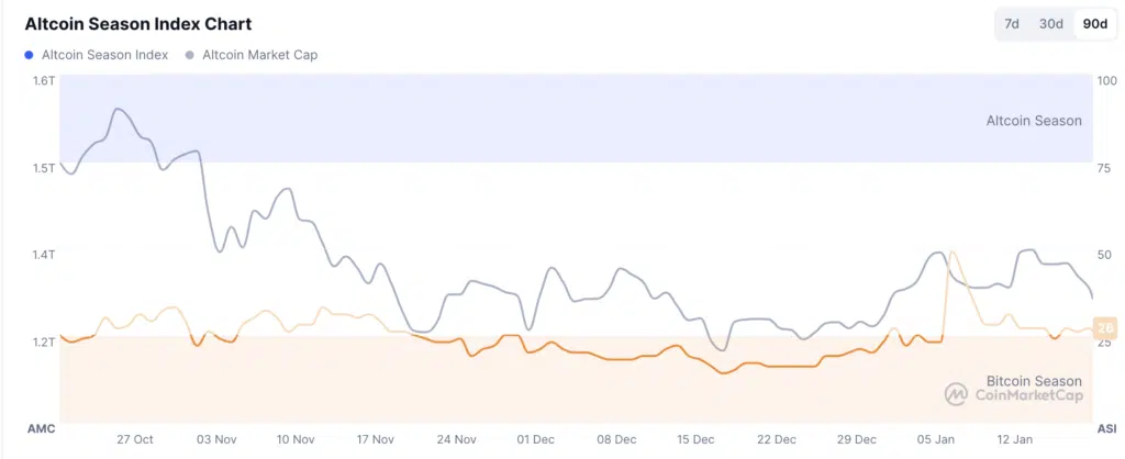 L’Altcoin Season Index di CoinMarketCap segnala una fase a favore di Bitcoin, con un valore pari a 26 su 100. Negli ultimi 90 giorni le altcoin hanno sottoperformato Bitcoin, evidenziando una perdita di forza relativa.