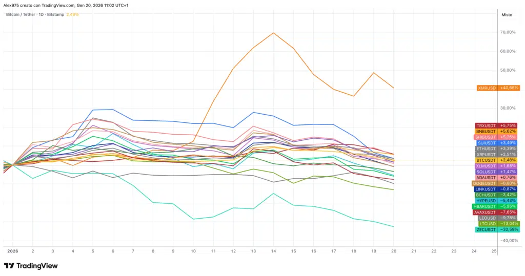 Se la fase crypto è ribassista, l’andamento osservato da inizio 2026 per la Top 20 rimane ancora per la maggior parte in positivo. Buona parte dei token è ancora in gain, dove spicca Monero, con una performance del +38%, seguito da Tron (recentemente analizzato), che registra un +7%. A scalare poi si trovano diversi token tra i quali Ethereum e Bitcoin. Sul lato ribassista emergono invece i cali marcati di Zcash a -32% e poi Litecoin a -14%.