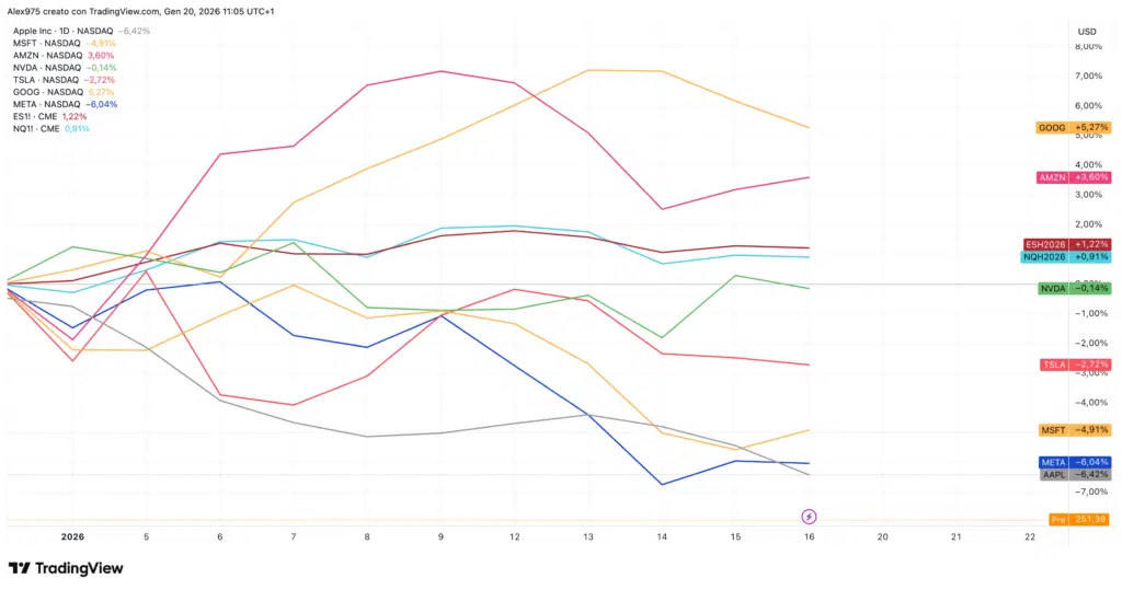 Osservando il grafico, stanno sovraperformando gli indici soltanto Google, con un +5,27%, e Amazon, con un +3,60%. Le altre cinque risultano invece in territorio negativo, con Apple e Meta che registrano perdite intorno al -6%. Il tutto avviene in un contesto in cui il Nasdaq rimane ancora marginalmente positivo, con una performance pari a +0,90%.