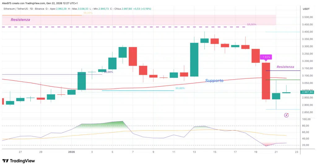 Passando all’analisi del grafico daily, riportiamo i movimenti di inizio gennaio. Si osserva l’allungo della scorsa settimana, con un massimo a 3.402 USDT, seguito da una fase di contrazione culminata nel crollo di due giorni fa, pari a -7,83%, la peggior chiusura daily da inizio novembre 2025.