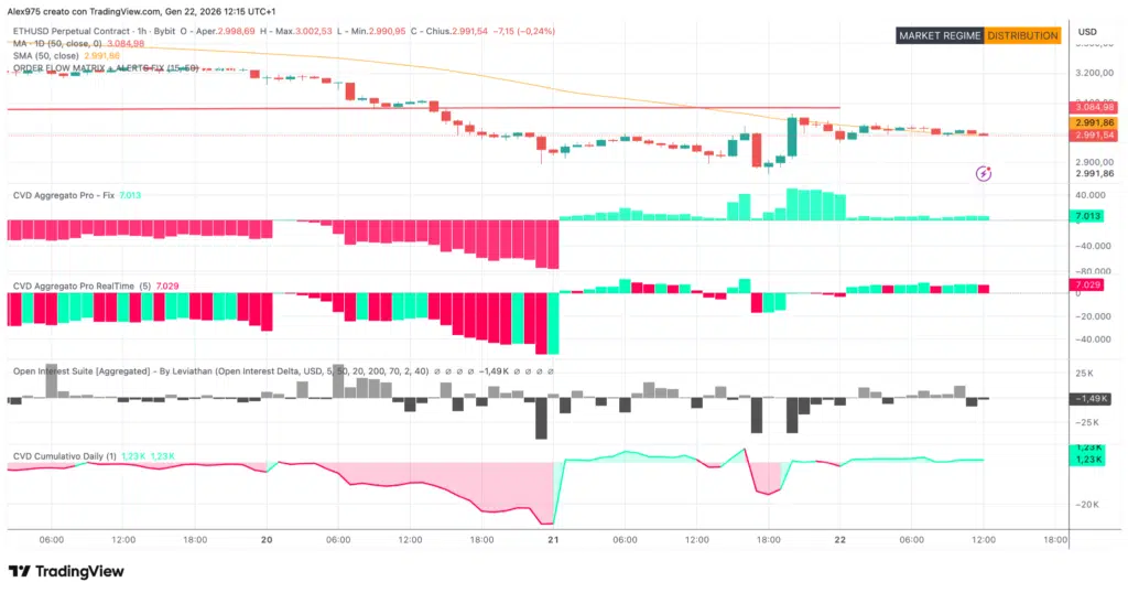 L’open interest tende a ridursi o rimanere instabile, indicando scarso appetito per nuove posizioni direzionali. Il regime finale di distribution suggerisce rimbalzi venduti e un mercato ancora privo di accumulazione strutturale, con ETH che fatica a costruire una base solida. Questa fotografia è basata sull’analisi dei movimenti intraday.