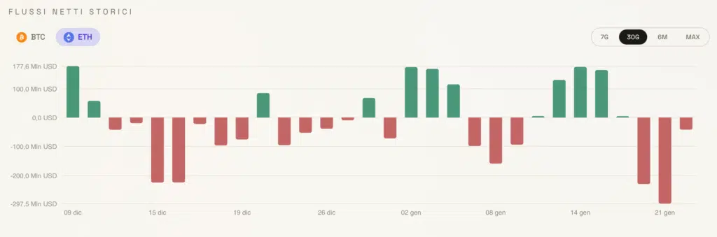 A meno di clamorosi stravolgimenti nella sessione di oggi, venerdì 23 gennaio, gli ETF crypto si apprestano a chiudere la peggiore delle settimane da novembre a questa parte. Per il solo Bitcoin, abbiamo già avuto oltre 1,2 miliardi di dollari di outflow, ovvero di capitali che sono fuoriusciti effettivamente da questi prodotti. Per Ethereum in rapporto performance anche peggiori, con oltre 500 milioni di fuoriuscita di capitali. È un outflow che ha esercitato delle pressioni importanti sul prezzo, probabilmente impedendo il ritorno su livelli di prezzo pre-Groenlandia.