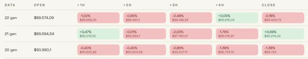 Aggiungiamo, sempre a scopo di studio, le performance ora per ora dall’apertura delle borse USA, su Bitcoin. Soltanto il 21 gennaio abbiamo avuto una chiusura positiva rispetto ai prezzi di apertura, per sessioni comunque volatili sì, ma con poca differenza tra apertura e chiusura in termini di prezzo.