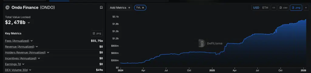 La crescita eccezionale della TVL di Ondo Finance la si può osservare sul grafico di DefiLlama. Dai 192 milioni di dollari di gennaio 2024 si è passati a circa 2,478 miliardi di dollari. L’aumento assoluto è di circa 2,29 miliardi, pari a una crescita di oltre 12 volte, circa +1.190%.