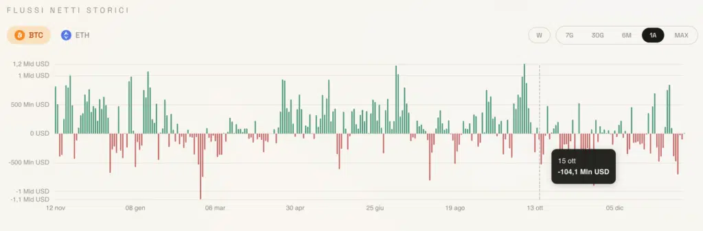 La prova di quanto diciamo? Ecco gli accumuli di Bitcoin tramite ETF (e dunque in larga parte investitori istituzionali), che hanno cambiato trend proprio a ridosso del 10 ottobre, mentre la prima parte del 2025 aveva visto degli inflow massicci.