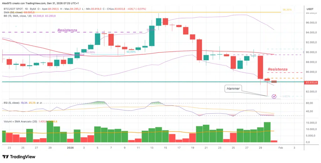 Sul grafico daily abbiamo una panoramica dell’andamento da inizio 2026 Ieri BTC ha chiuso configurando una candela hammer, che rientra tra i pattern di inversione. Questo segnale acquista valore quando si forma lungo downtrend come quello attuale. Per una fase di rimbalzo si dovrà attendere una conferma nella giornata di oggi.